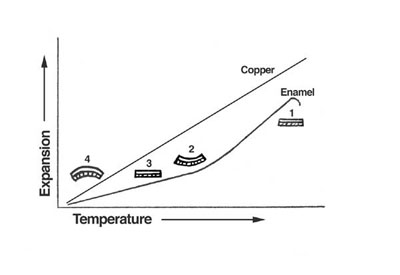 - Figuur 2: het normale verloop van de thermische uitzetting van koper en email