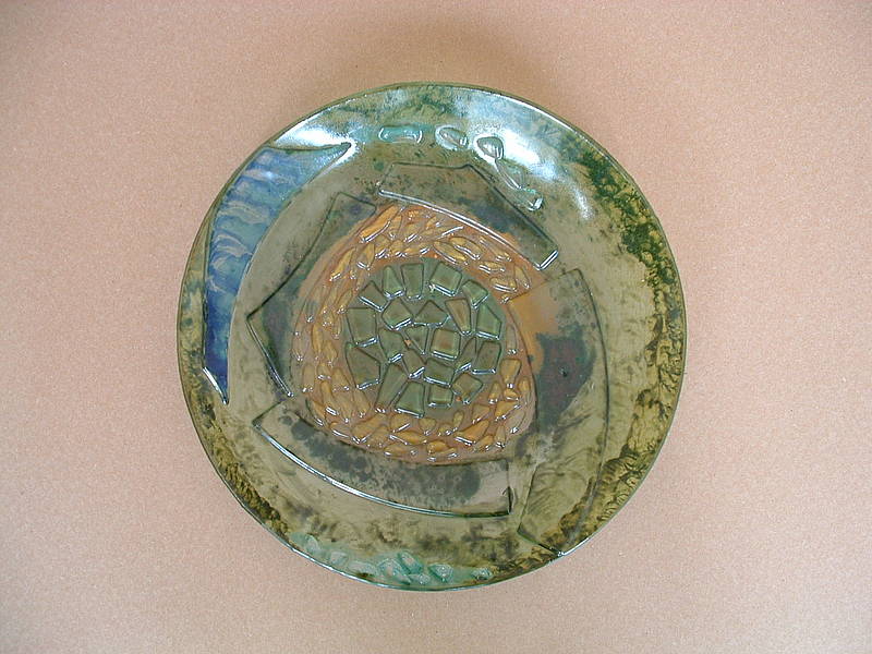 Some time later the artist group of which I am a member was offered a new studio complex. It was a former school building and the Dutch equivalent of the National Trust offered to renovate it for us, to make it suitable for use by artists. During the renovation a lot of the old glass doors were replaced and the old glass was taken away for recycling. I asked if I might keep some of the glass for use in art projects, and when permission was granted I enrolled in a course for beginning glass workers. It was there that I made my first glass bowls and other objects. (Click on the photograph to enlarge.)